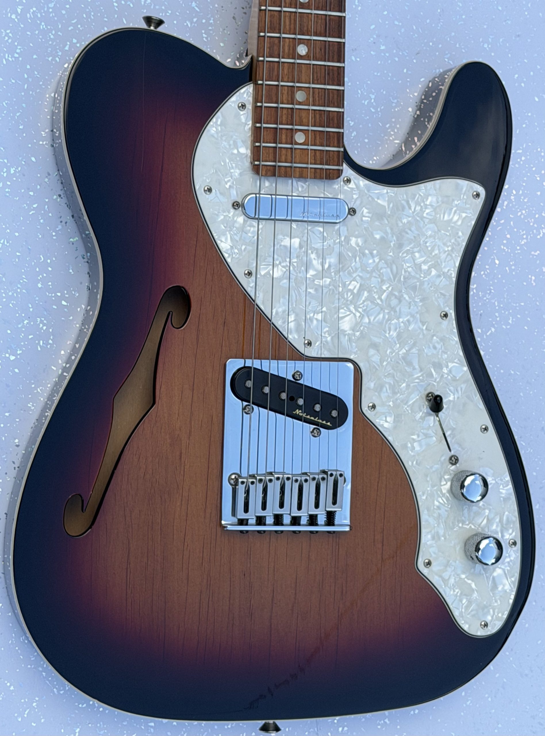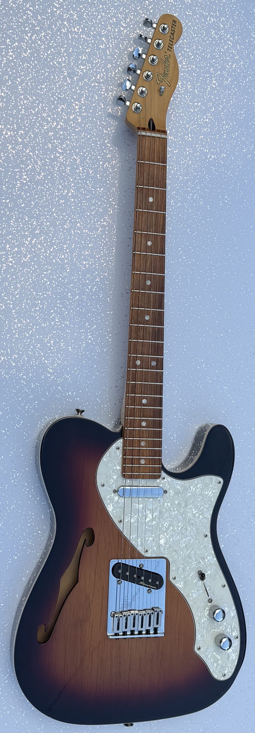 electric guitar, made in Mexico; Body: three-tone sunburst finish, small ding to back edge and a very faint mark to the right of the f-hole as shown in photos; Neck:maple; Fretboard: Pau Ferro; Frets: excellent; Electrics: all working; Hardware: good; Weight: 3.08kg; Overall condition: excellent. It is nicely set up and it’s a joy to play. It comes complete with a gig bag.