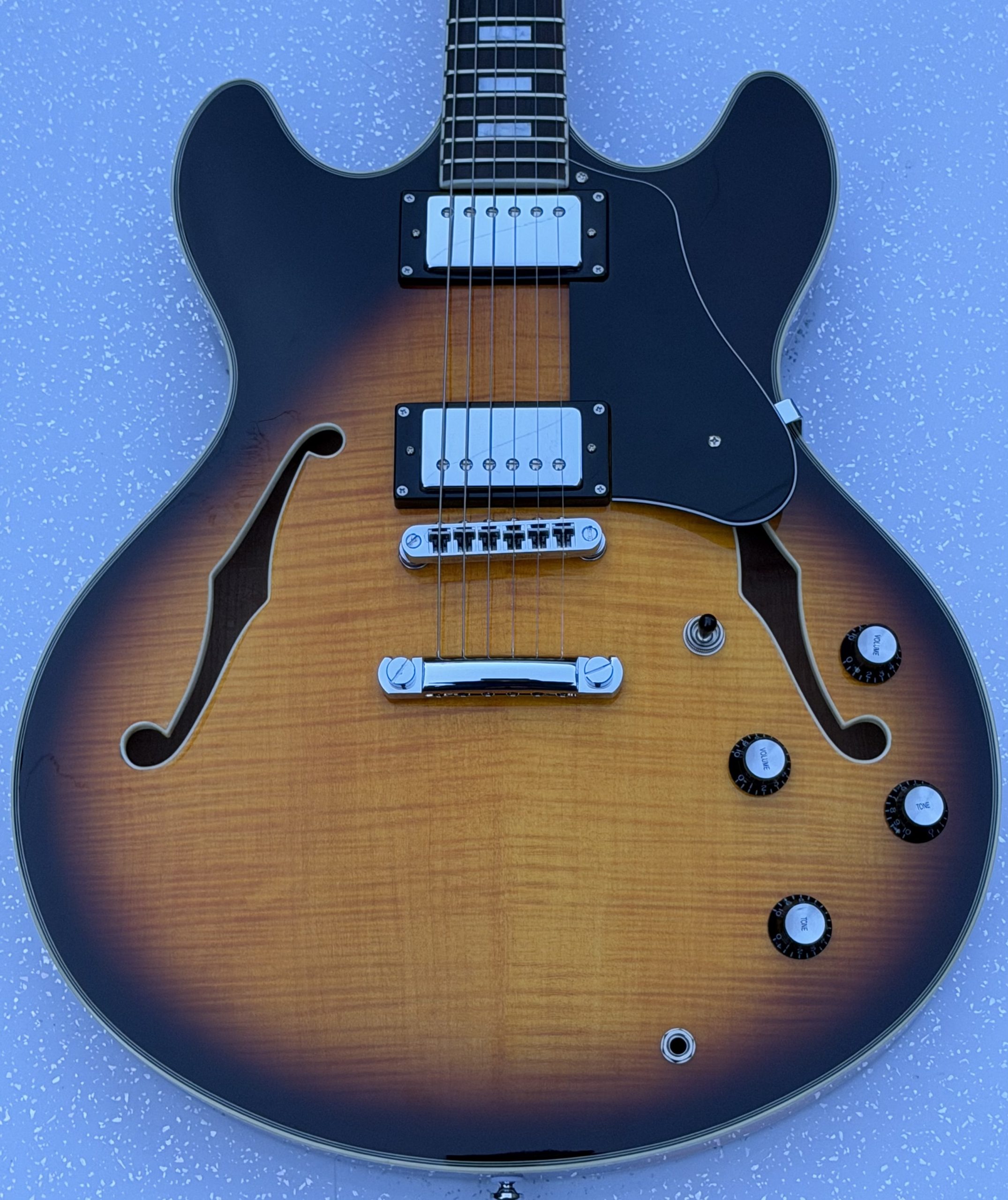 2022 Sire Larry Carlton H7 semi-hollow body electric guitar, made in Indonesia; Body: two-tone sunburst finished maple; Neck: sunburst finished maple; Fretboard: rosewood with pearl
