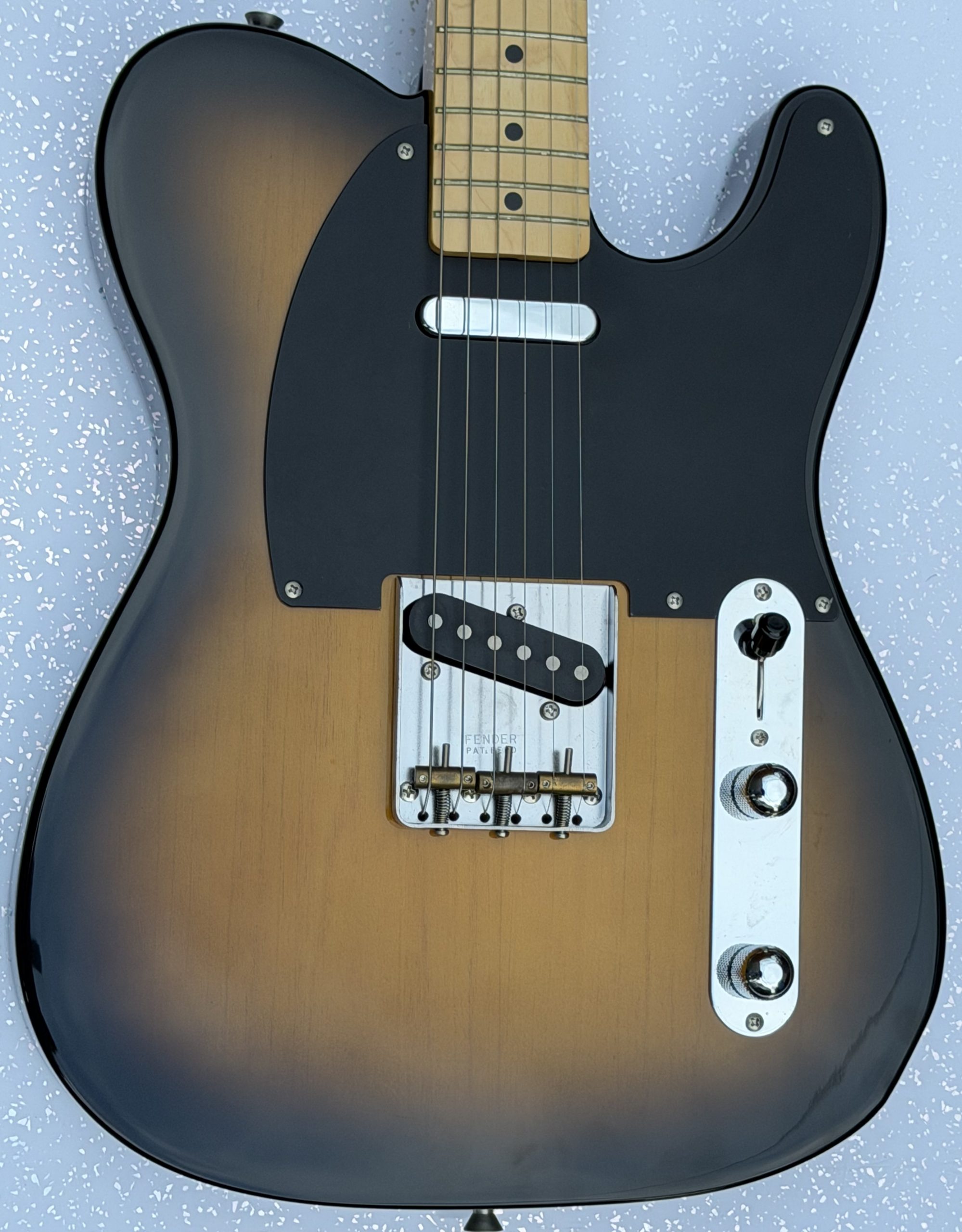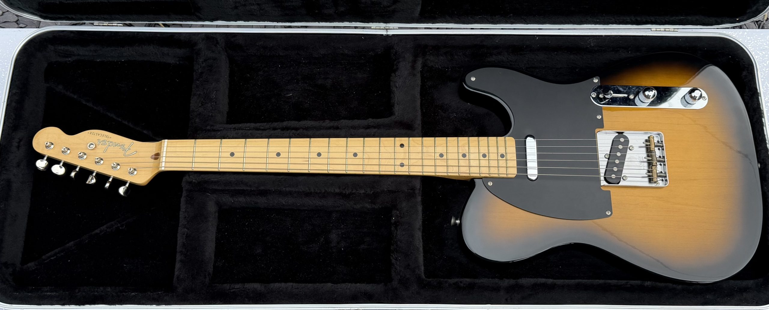 sunburst finish, minor dings to back; Neck: maple; Fretboard: maple; Frets: excellent; Electrics: all working; Hardware: