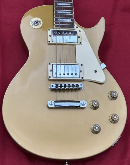 JHS Vintage V99 electric guitar; Body: Gold finish, minor marks; Fretboard: rosewood; Frets excellent; Electrics: all working; Hardware: excellent; Case: Gibson gig bag, slightly tatty but functional; Weight: 3.89kg; Overall condition: excellent. It is set up nicely and it plays great.