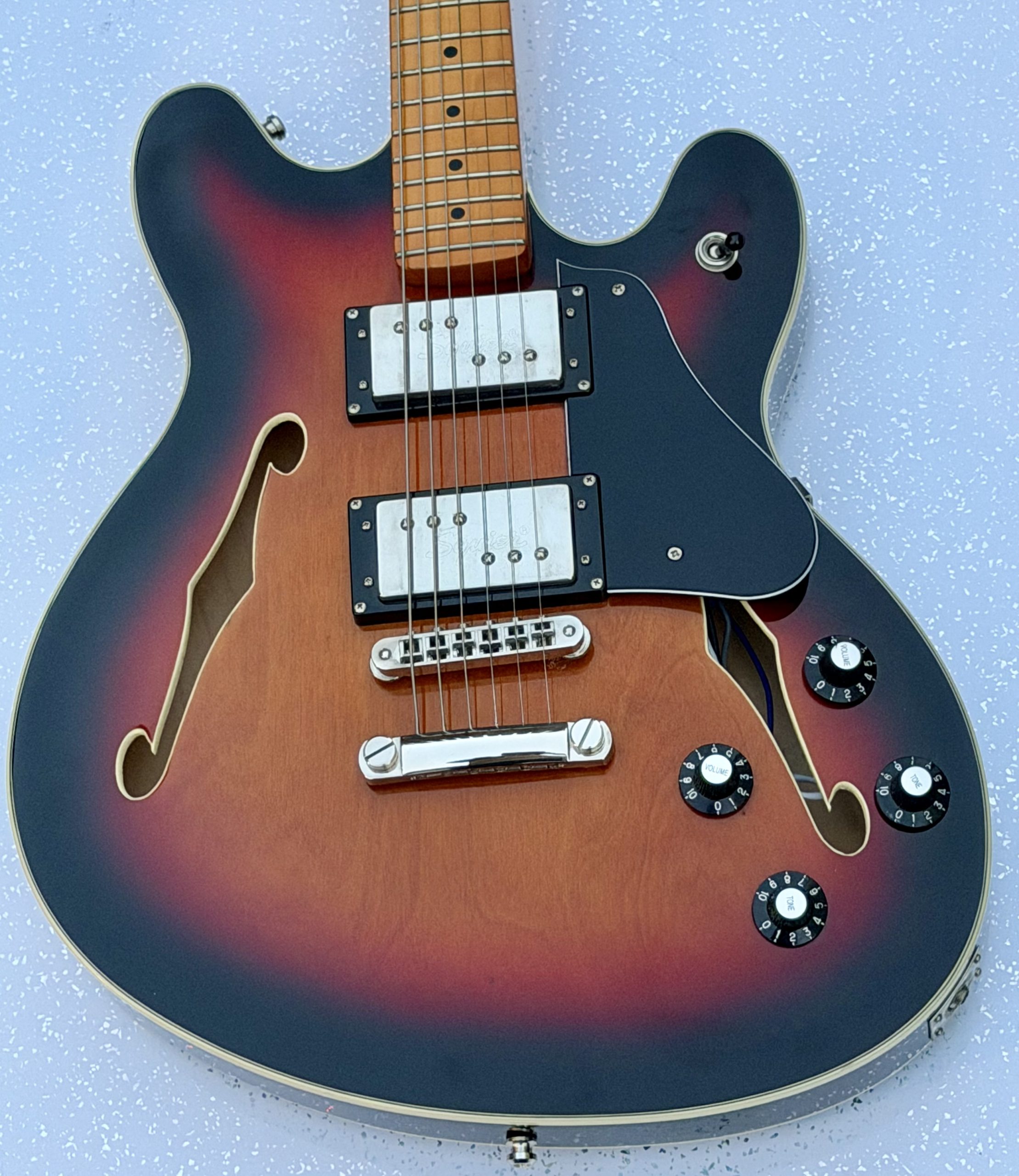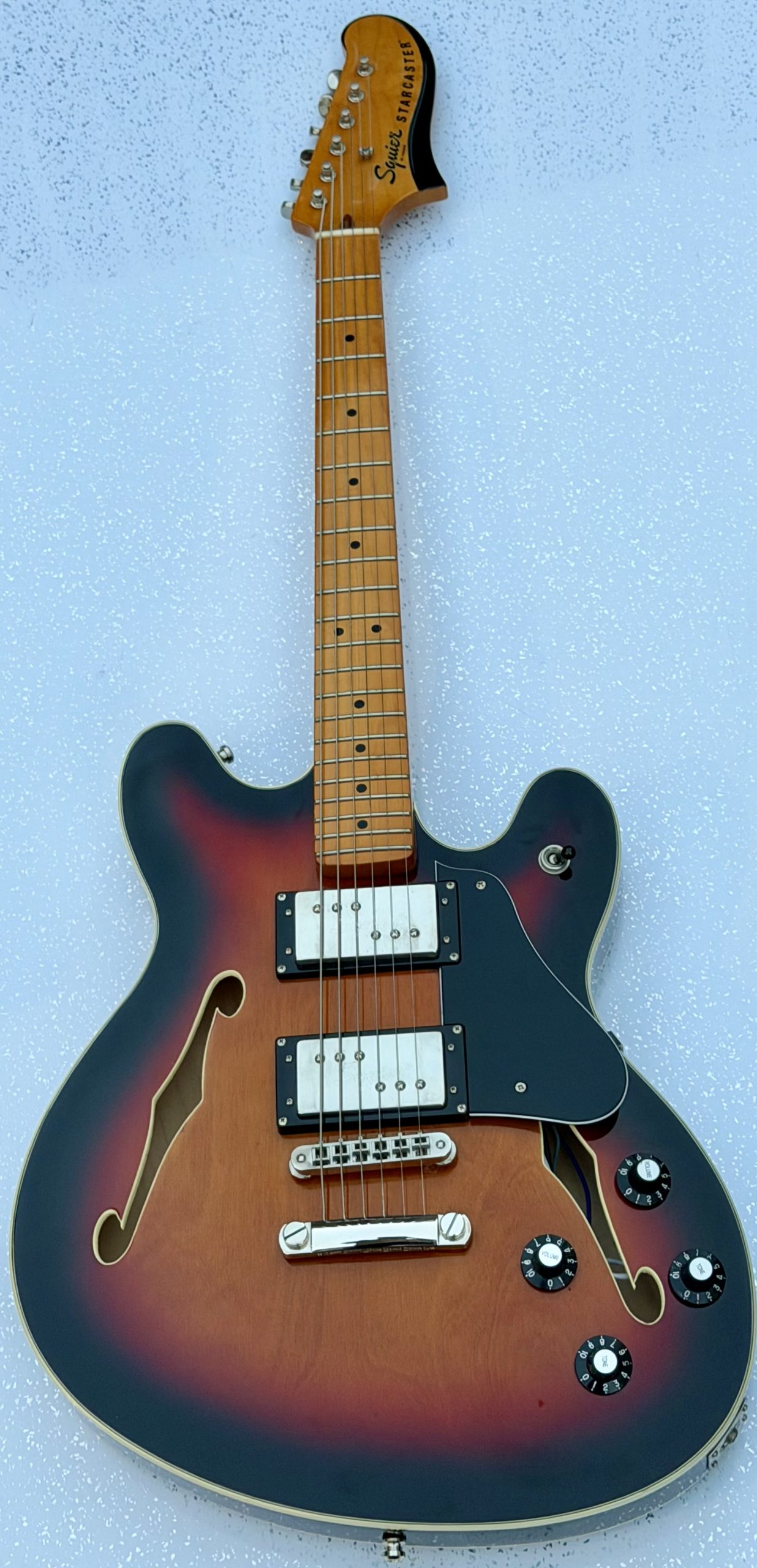 SQUIER CLASSIC VIBE STARCASTER IN 3 TONE SUNBURST with a maple neck. This guitar is in superb condition virtually flawless. It is nicely set up and it plays great. It comes complete with a Gaucho Strap, Schiller strap locks and a Fender Gig bag.